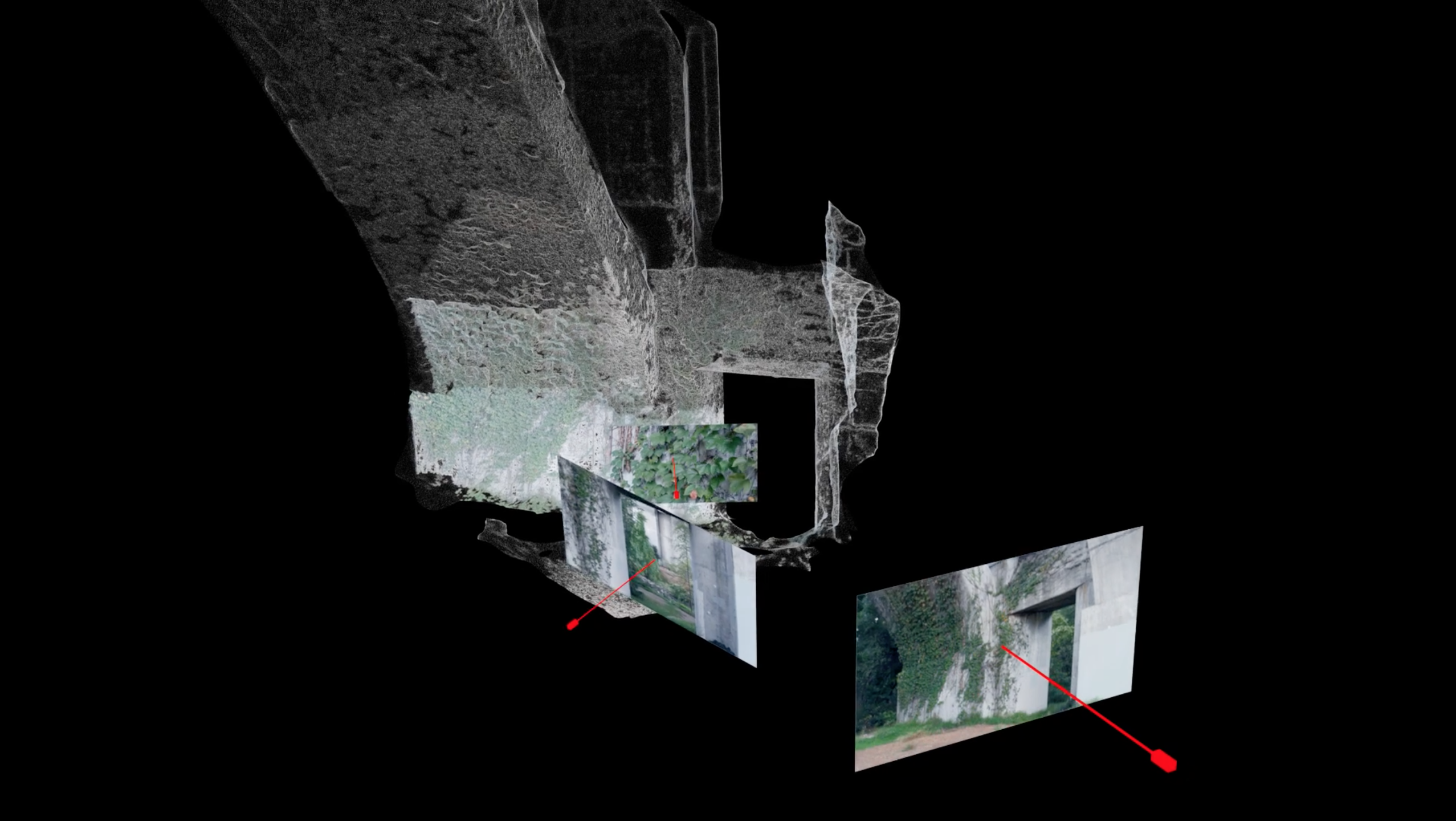 site in the form of a point could. Images from the data set that was used to generate the point cloud are then interpolated with the scene, re-positioned and re-animated to reflexively show their original capture of the scene. There is an interest to find ways to justapose cinematic aesthetics with computational aesthetics, in the context of the gaze of future cinema technologies. Photogrammetry is a technique to create a computational scan of a scene using ordinary photographic cameras, a branch of technology known as reality computing.